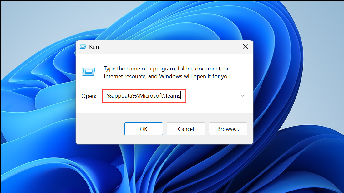 Step 2: Press Win + R, then paste %appdata%\Microsoft\Teams and press Enter. This opens the Teams cache folder.
