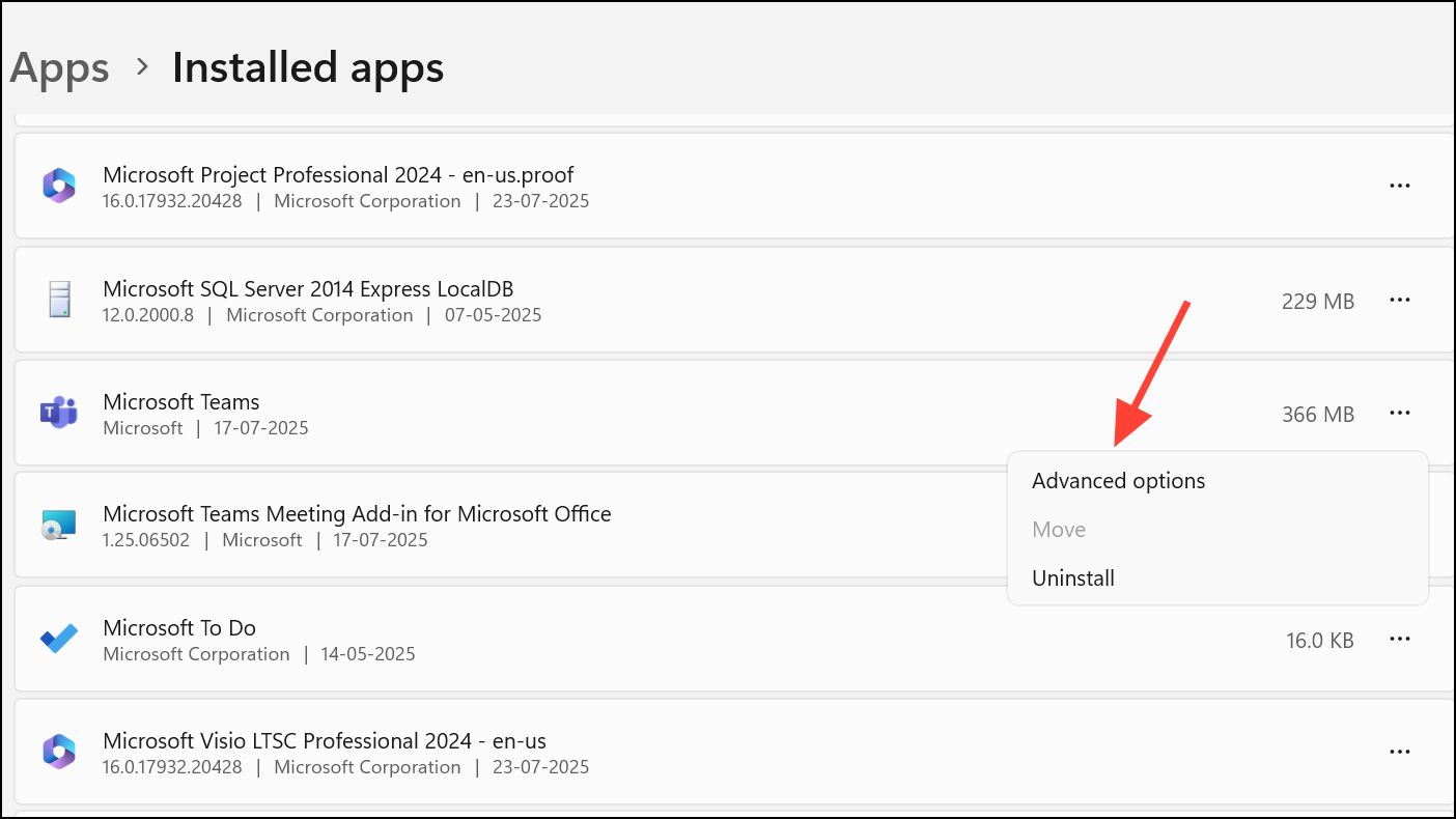Step 1: Open Windows Settings, select Apps, then Installed Apps. Find Microsoft Teams in the list, click the three-dot menu, and choose Advanced options.