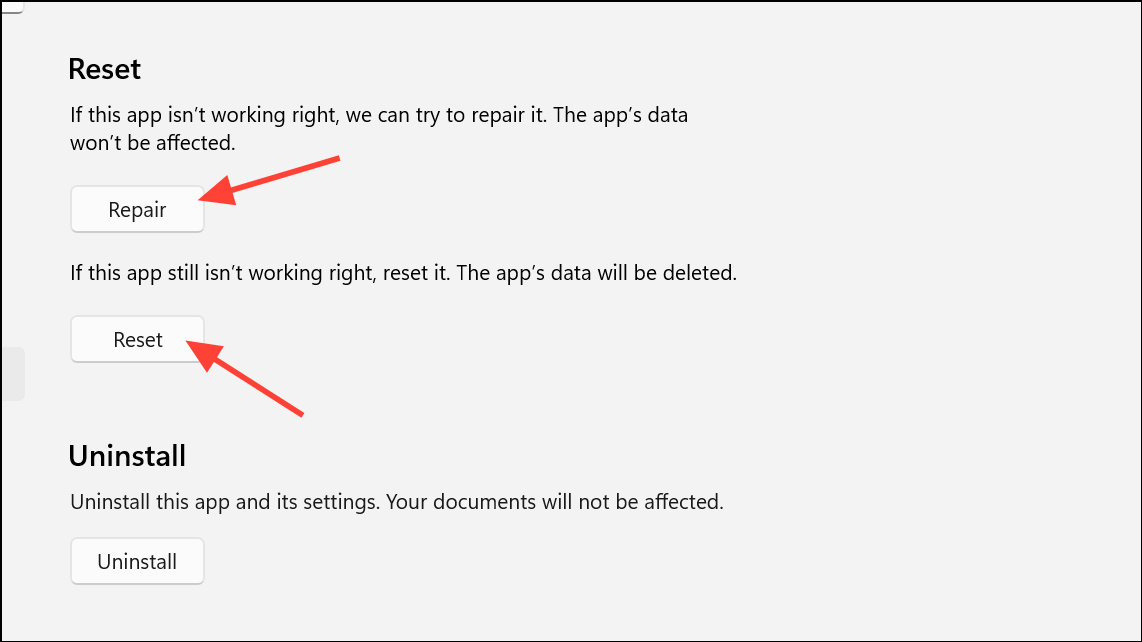 Step 2: Scroll to the Reset section. First, try Repair to fix the app without affecting your data. If Teams continues to crash, use the Reset option, which restores factory defaults and removes all Teams data from your device. Note that you will need to sign in again and reconfigure any custom settings after a reset.