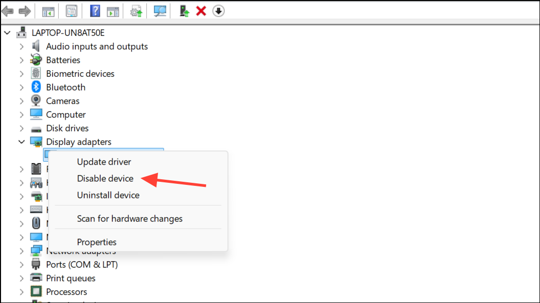 Step 5: If updating does not resolve the crashes, right-click the graphics device in Device Manager and choose Disable device. Confirm the action, then test Teams again. If Teams stops crashing, the display driver is likely the culprit. Re-enable the device after testing.