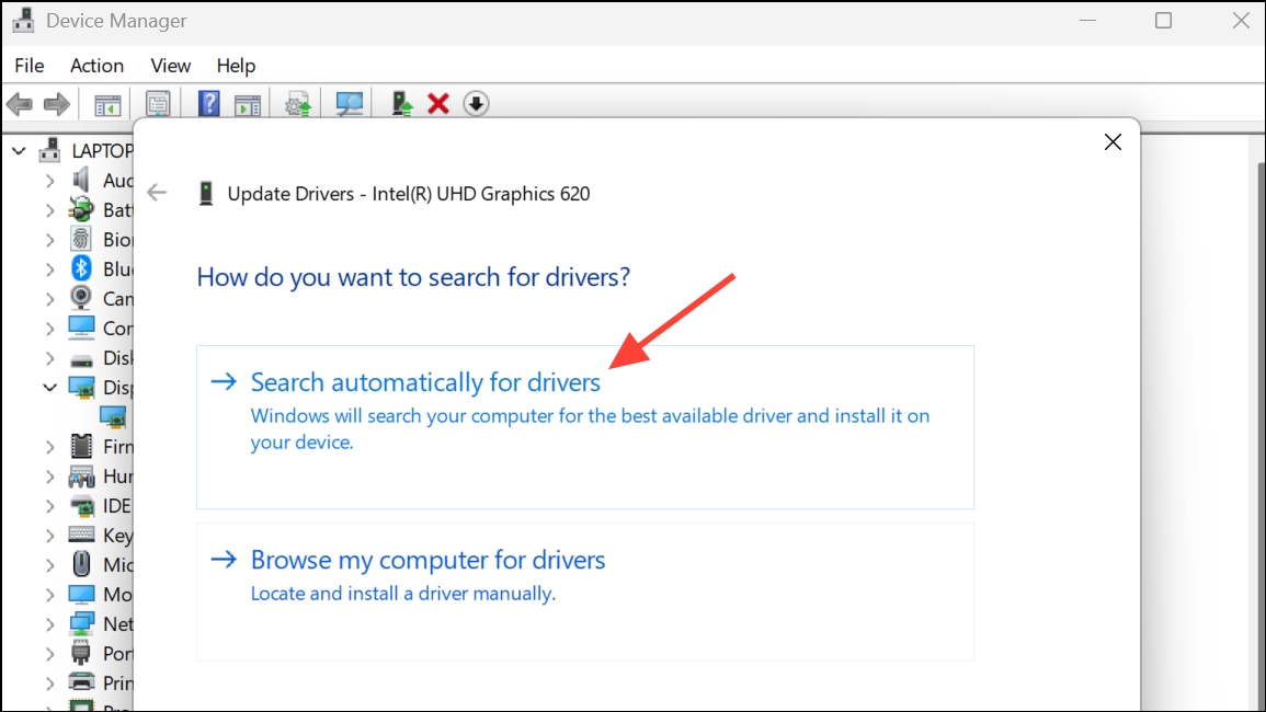 Step 3: Choose Search automatically for drivers and allow Windows to find and install the latest version. If no new driver is found, visit your GPU manufacturer’s website (NVIDIA, AMD, or Intel) to manually download the latest driver for your card and Windows 11.
