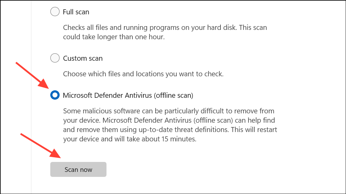 Step 2: Click Virus & threat protection, then Scan options. Choose Microsoft Defender Offline scan and start the scan. This will check for rootkits and persistent malware.