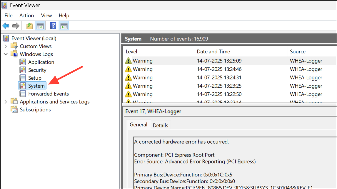 Step 2: Expand Windows Logs and select System. Look for errors or warnings with timestamps matching your shutdown events. "Kernel-Power" event 41 indicates a sudden loss of power, often due to hardware failure.