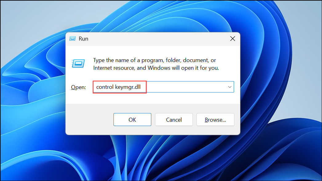 Step 1: Press Windows + R to open the Run dialog, then enter control keymgr.dll and hit Enter. This opens the Stored Usernames and Passwords manager.