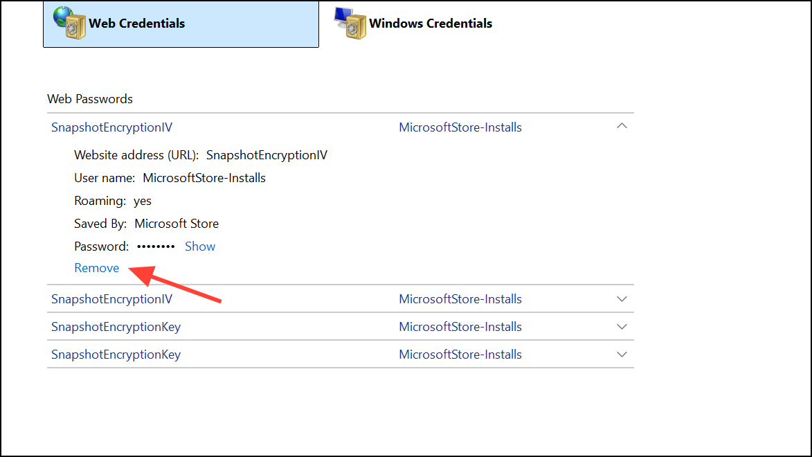 Authentication failures after recent password changes or account recovery can cause error 0x80190001. Removing old credentials ensures Windows uses your updated login details and prevents token mismatches.