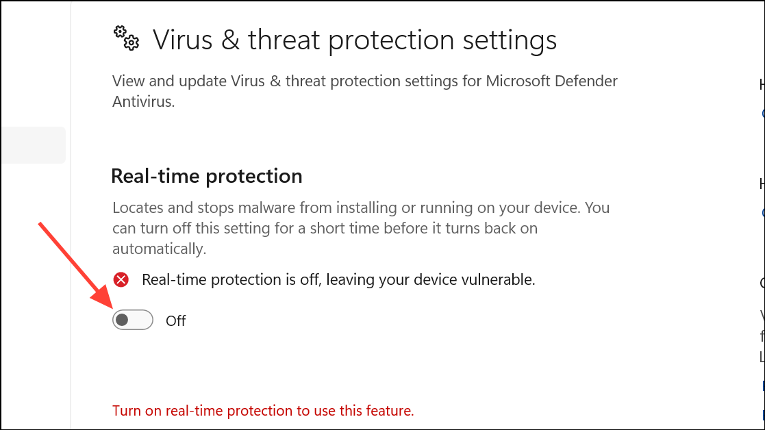 Step 2: In Windows Security, go to Virus & threat protection > Manage settings and toggle off Real-time protection.