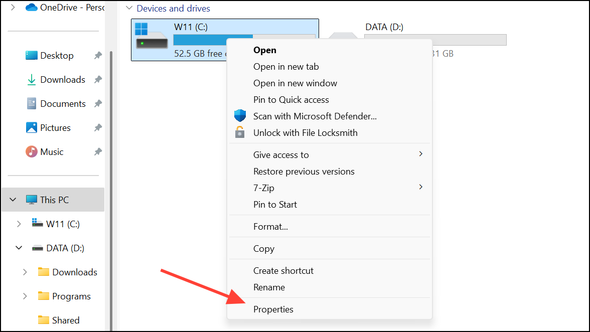 Step 1: Press Windows + E to open File Explorer. Right-click your system drive (usually C:) and select Properties.
