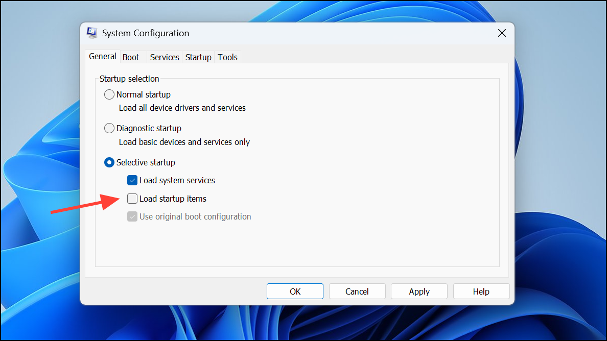 Step 2: Under the "General" tab, select "Selective Startup" and uncheck "Load startup items."