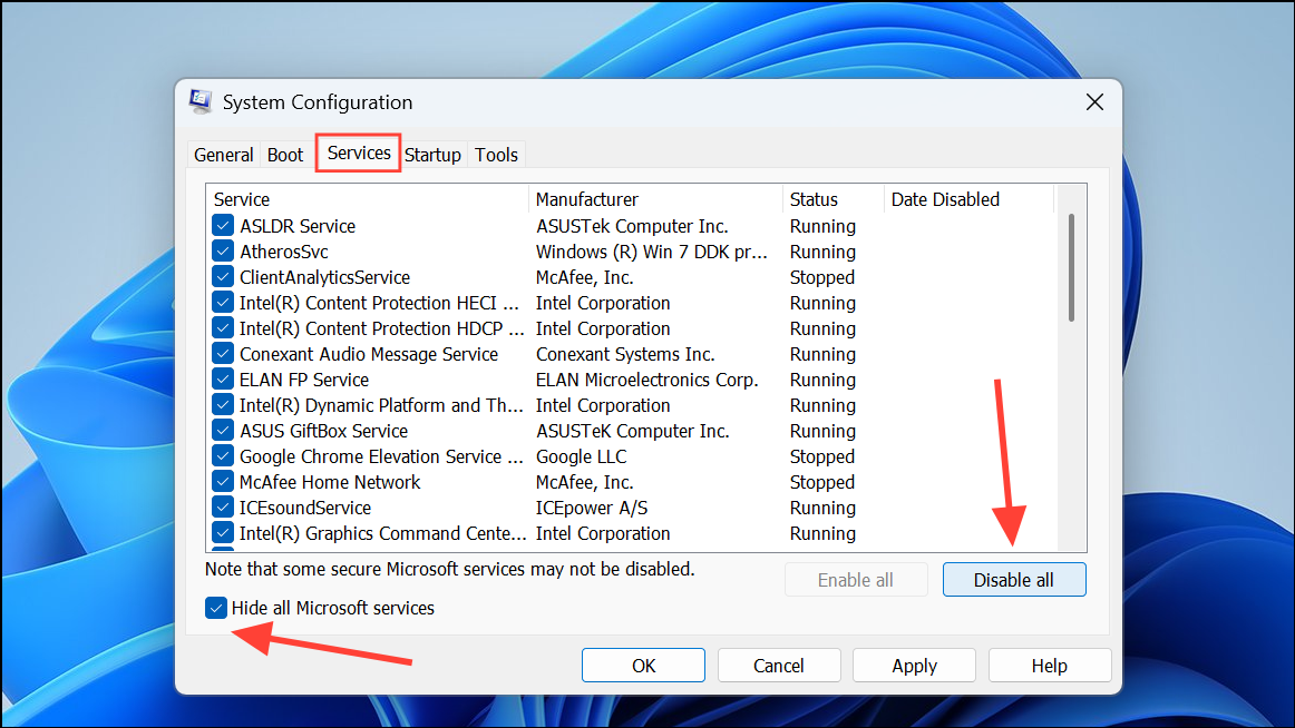 Step 3: Go to the "Services" tab, check "Hide all Microsoft services," then click "Disable all."