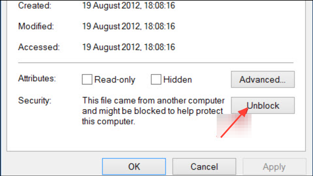 Step 3: In the Properties window, look for an Unblock checkbox or button near the bottom right. If present, check it and click Apply, then OK.