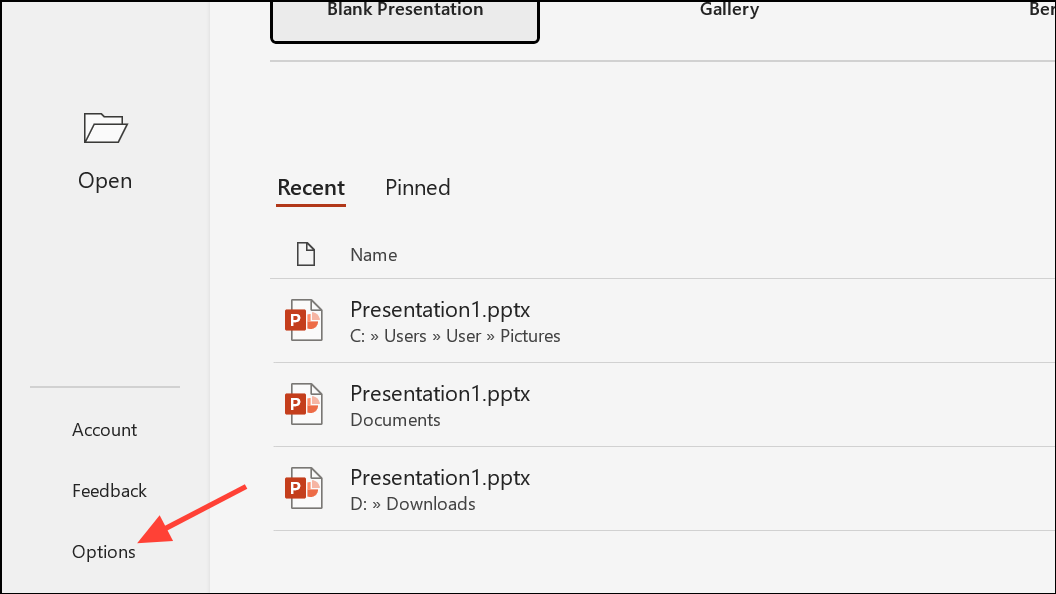 Step 1: Open PowerPoint and go to File > Options.