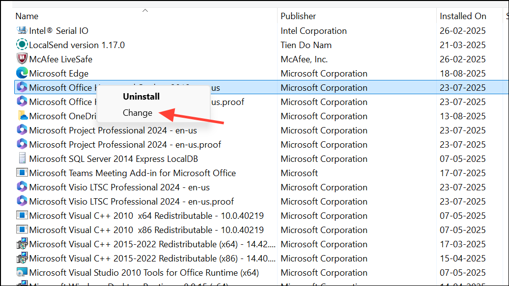 Step 3: Find Microsoft Office in the list, right-click it, and choose Change.