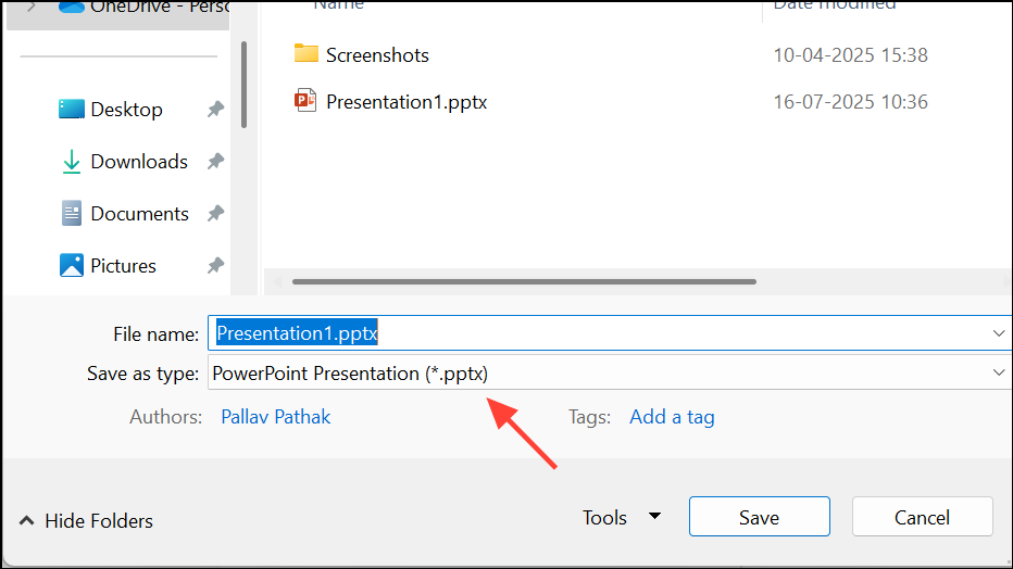 Step 2: Use File > Save As and select PowerPoint Presentation (*.pptx) as the file type.