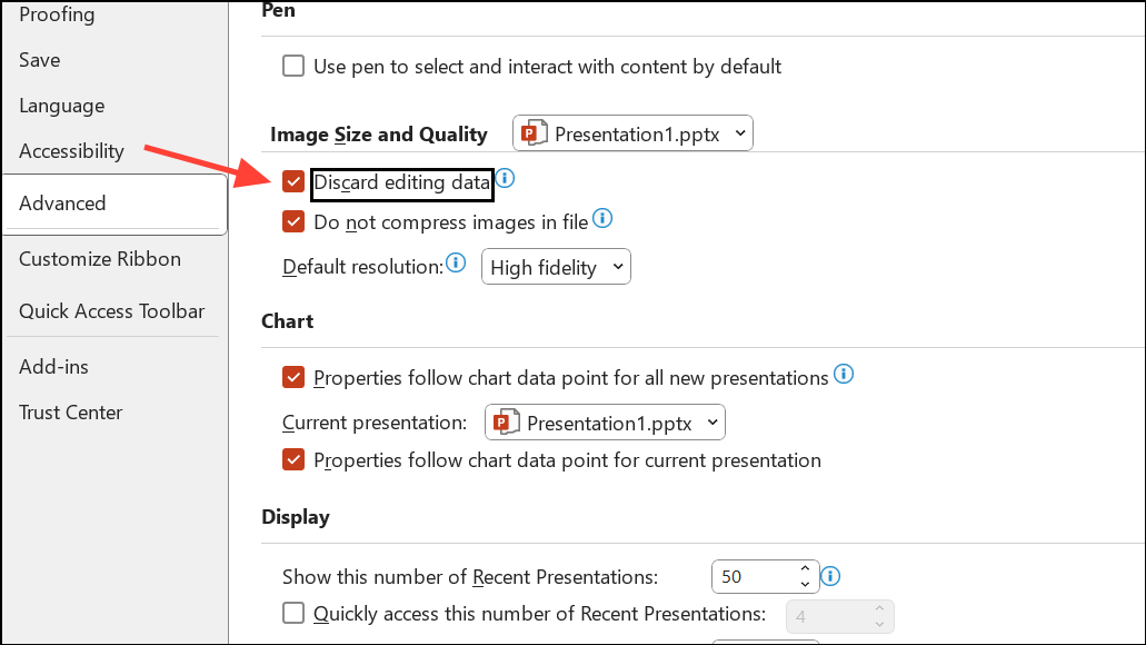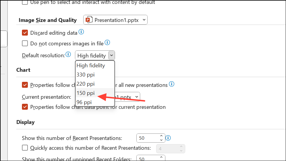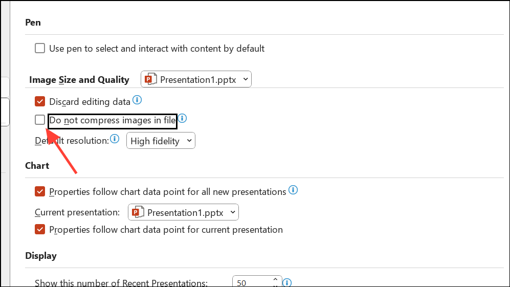 Step 5: Ensure Do not compress images in file is not checked. This setting allows PowerPoint to compress images and reduce file size.