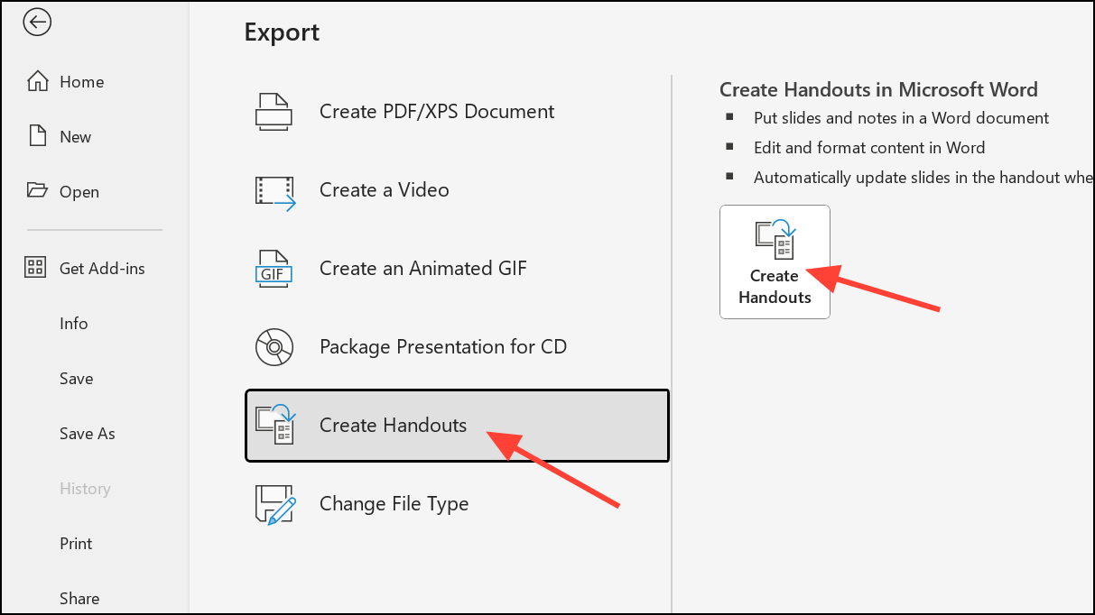 Step 8: Try exporting the presentation again by clicking File > Export > Create Handouts > Create Handouts in Microsoft Word. Select your preferred layout and click OK.