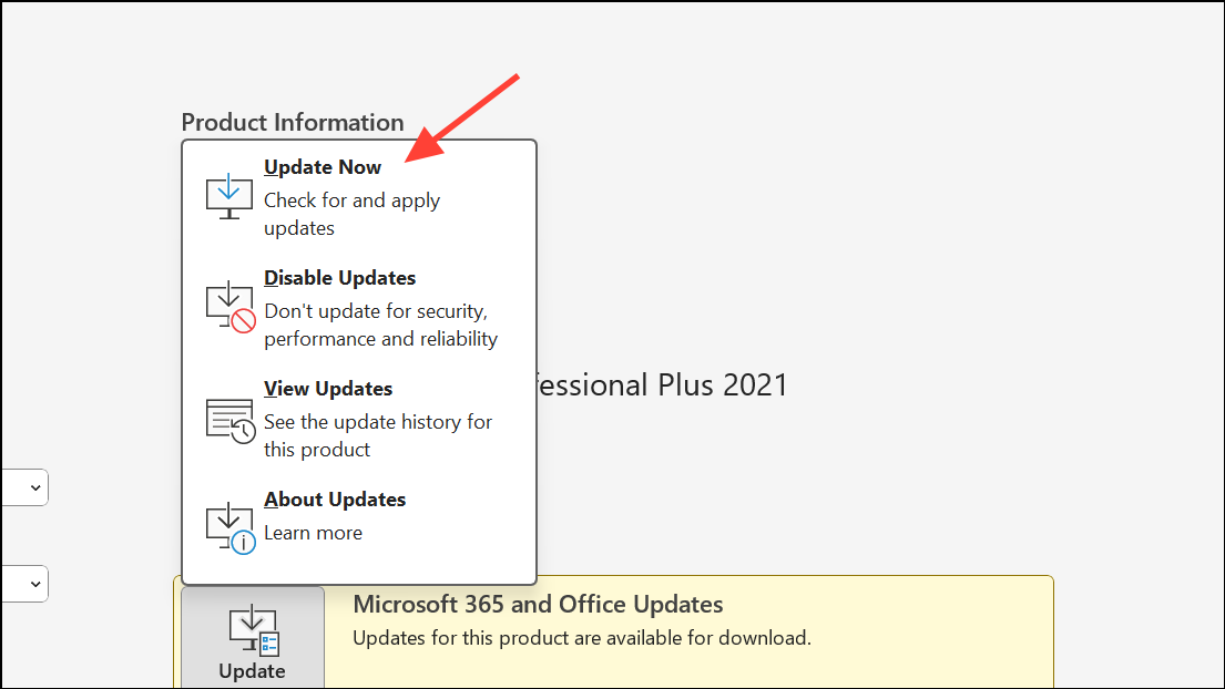 Step 1: Open any Office application and go to File > Account > Update Options, then select Update Now to check for and install updates.