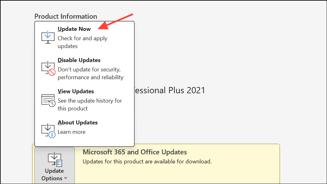 Step 2: Under Product Information, click Update Options, then select Update Now. This checks for and installs the most recent Office updates.