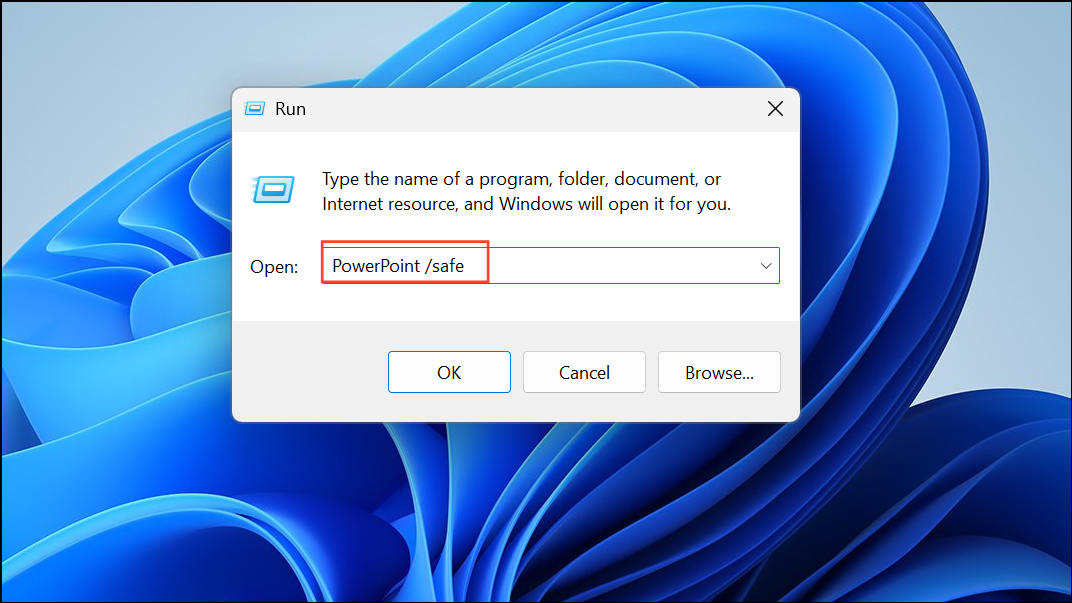 Step 1: Open the Run dialog using Win + R, type PowerPoint /safe, and press Enter. This launches PowerPoint without any add-ins enabled.