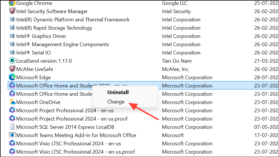 Step 3: Locate your Microsoft Office installation in the list, right-click it, and select Change.