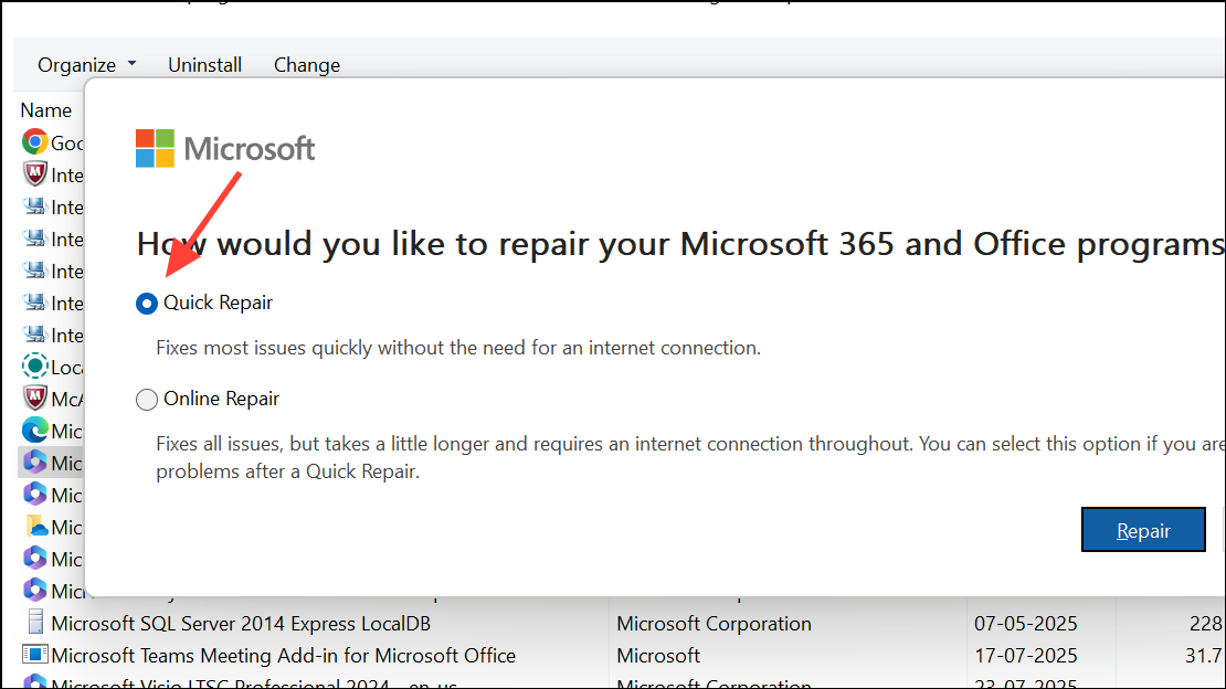 Step 4: Choose Repair (select Quick Repair for a faster process or Online Repair for a more thorough fix if the first attempt fails). Follow the prompts to complete the repair.