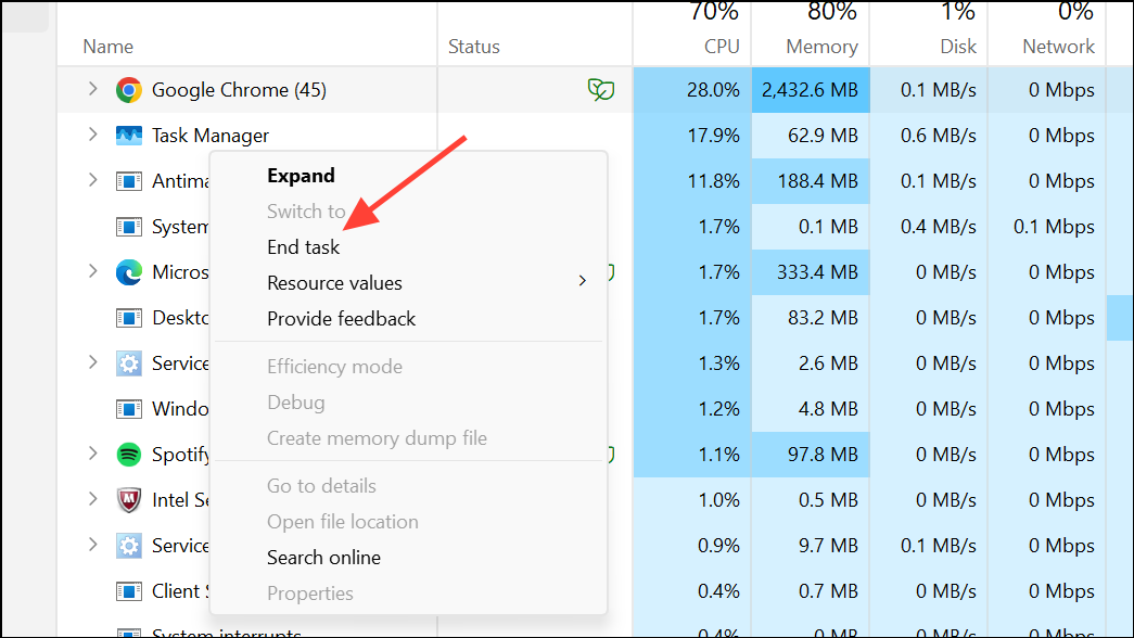 Step 2: Under the Processes tab, identify programs using high amounts of memory or CPU.