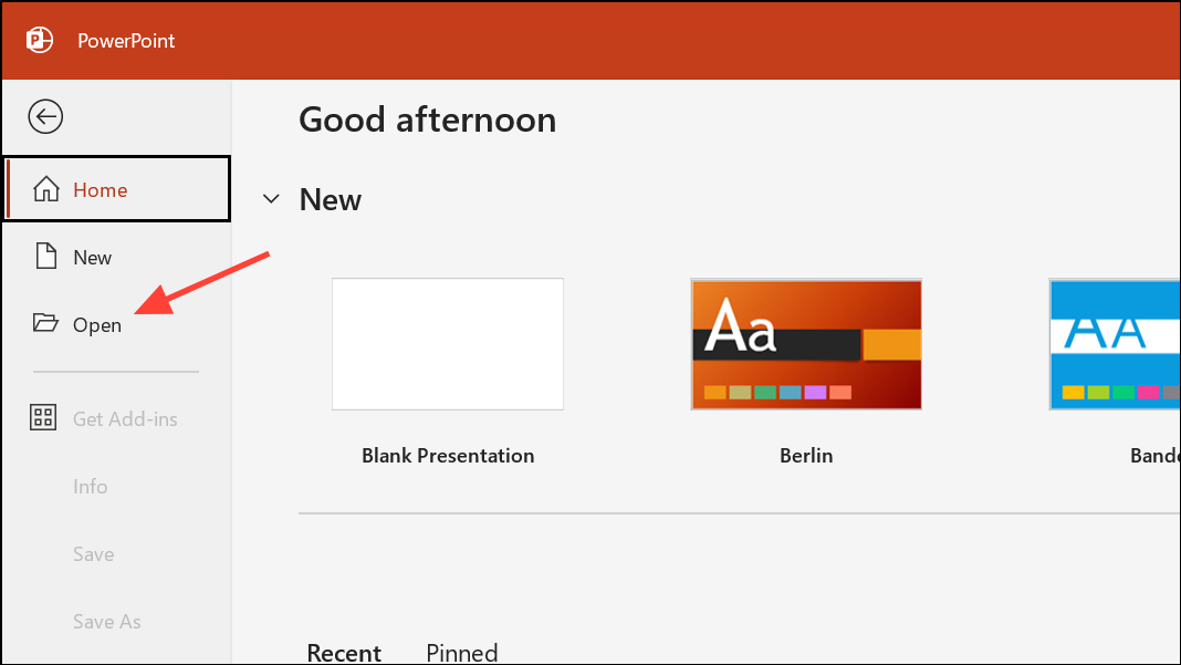 Step 2: If the pane does not appear, go to File > Open, then select Recover Unsaved Presentations at the bottom of the window.