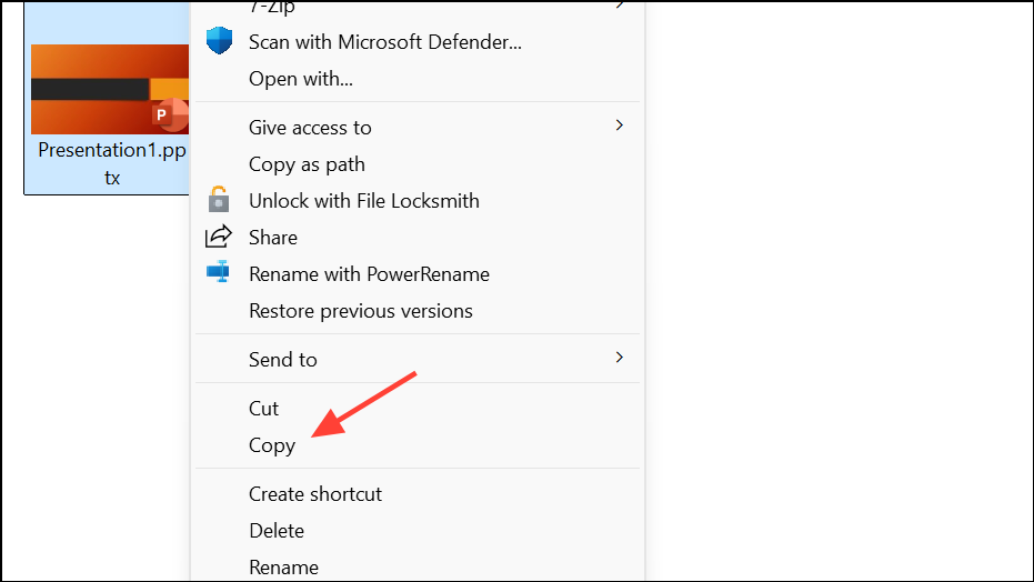 Step 2: Navigate to the folder containing your PowerPoint file. Right-click the file and select Copy, then right-click in the folder and select Paste to create a duplicate.