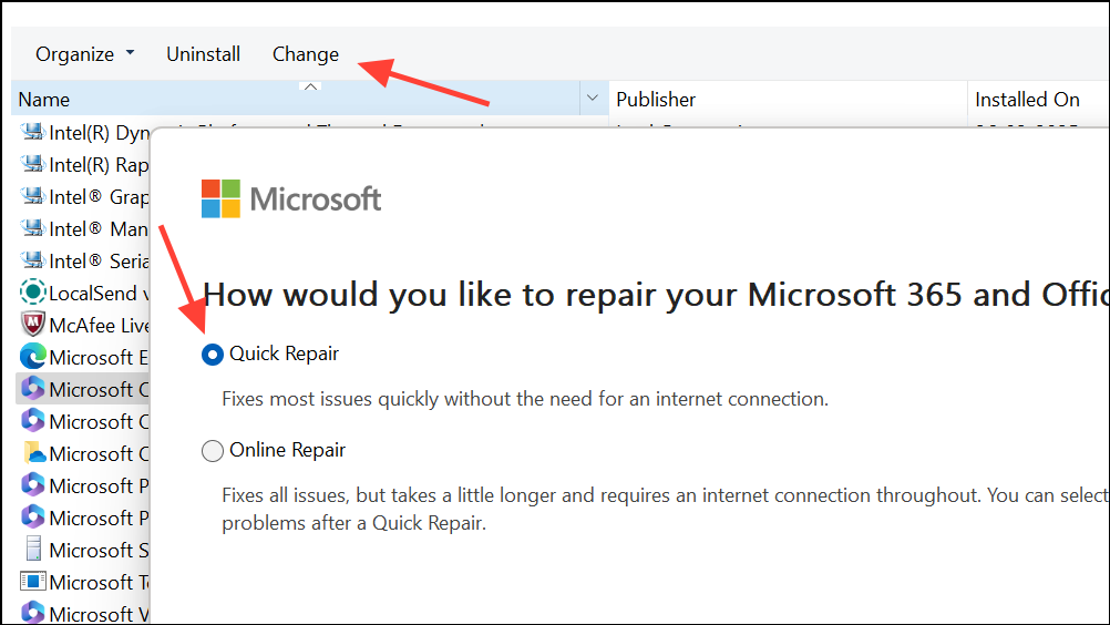Step 3: Follow the prompts to repair the installation. Choose the online repair option if available for a more comprehensive check.