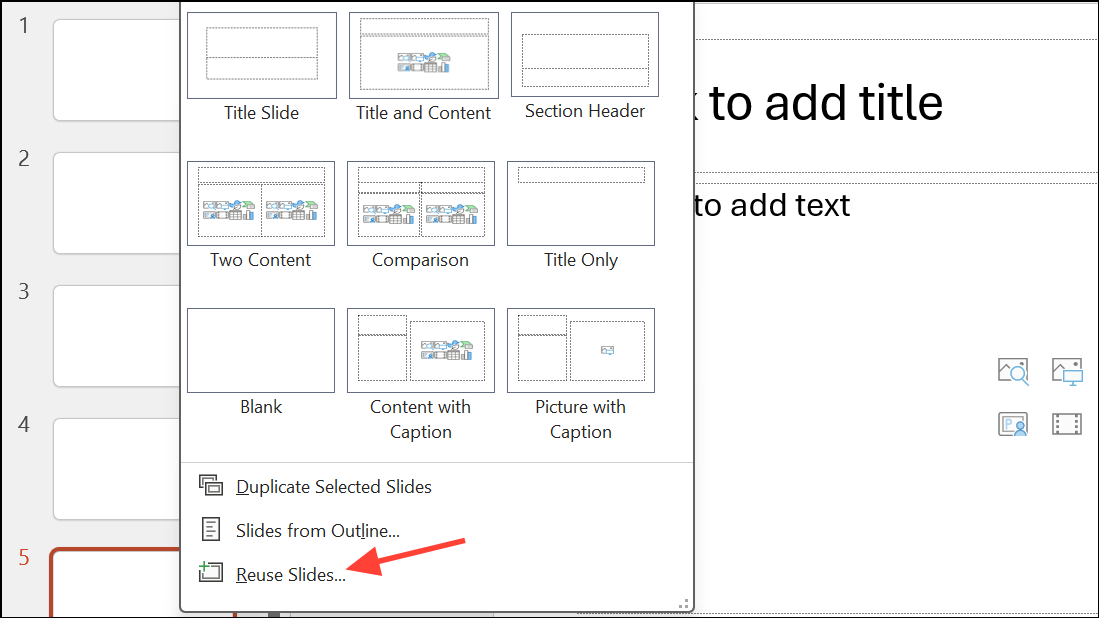 Step 2: Go to the Home tab, click the arrow next to New Slide, and select Reuse Slides.