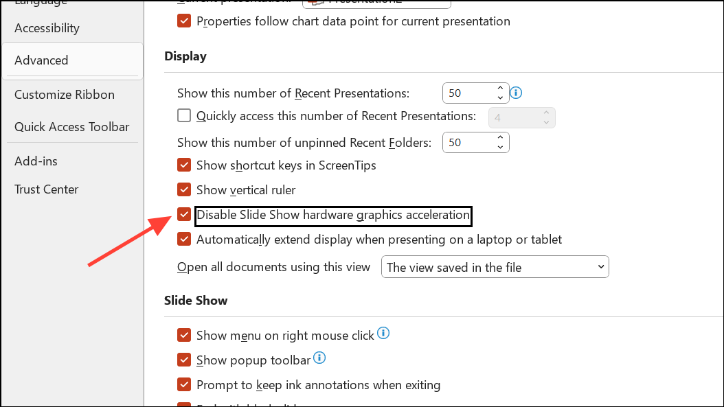 Step 1: In PowerPoint for Windows, go to File > Options > Advanced, scroll to the Display section, and check Disable slide show hardware graphics acceleration. Click OK and restart PowerPoint.