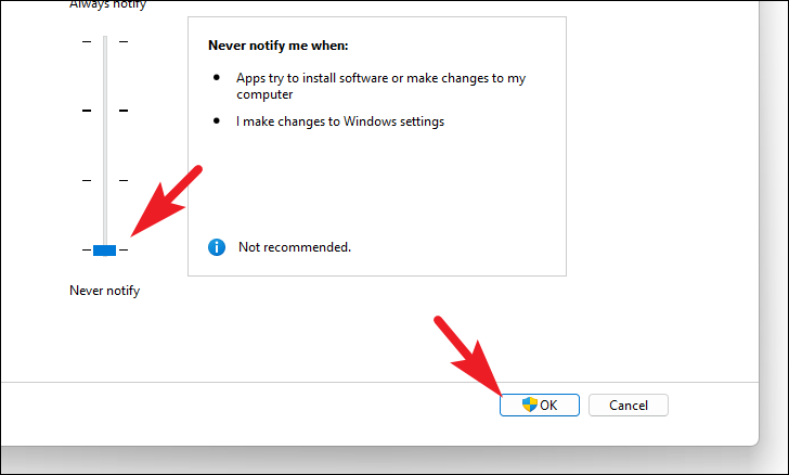 Step 4: In the UAC settings window, move the slider all the way down to 'Never notify'. Click 'OK' to save the changes. Note that this setting will disable UAC prompts, which might make your system less secure. Remember to revert this setting after completing the upgrade.