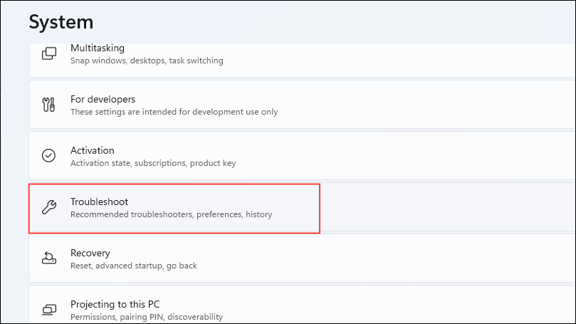 - On the System page, scroll down and click on 'Troubleshoot'.