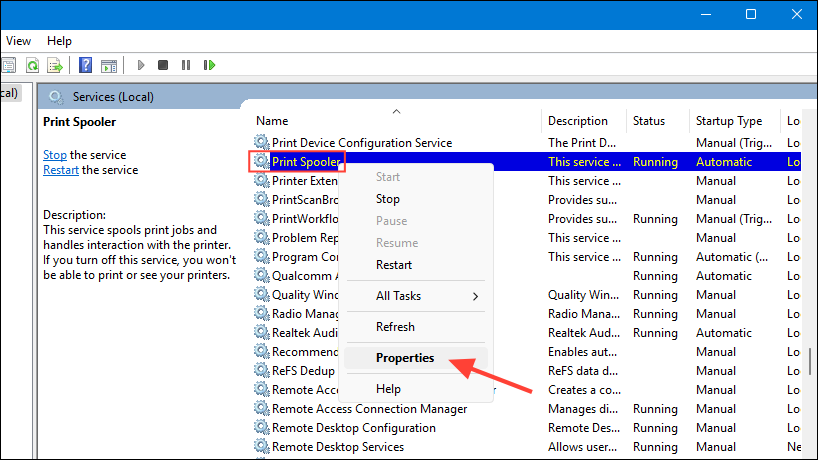 - When the Services utility opens, scroll down to the Print Spooler service, right-click on it, and select 'Properties'.