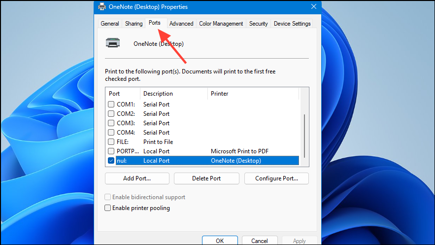 - Then click on the 'Ports' tab in the Printer Properties dialog box.