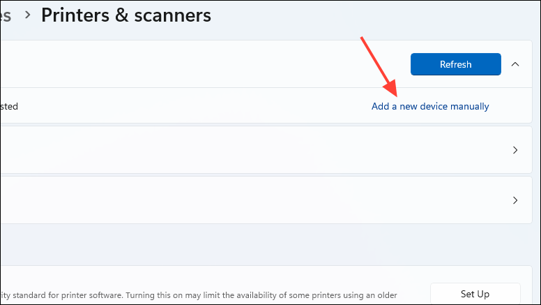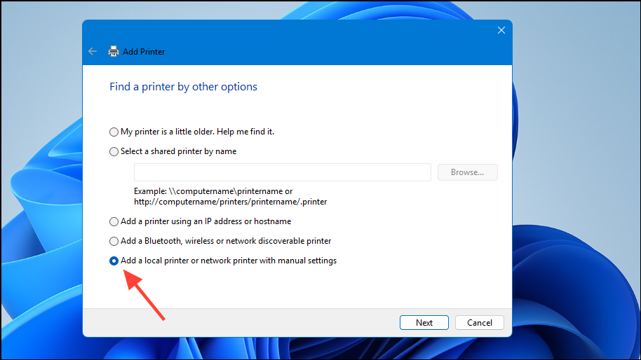 - In the pop-up that appears, click on 'Add a local printer or network printer with manual settings'.