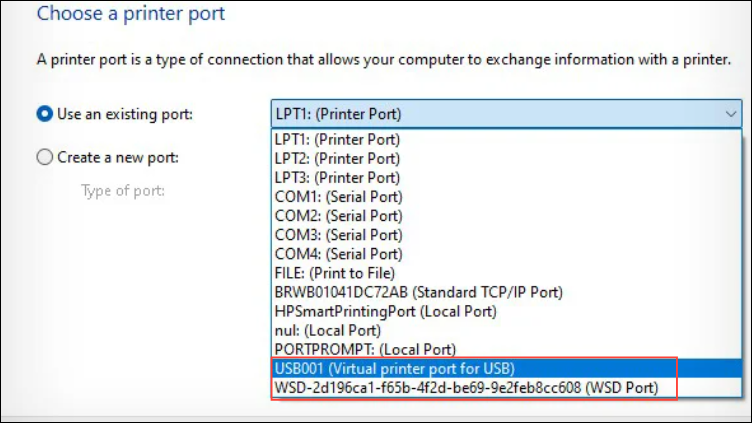- Then, depending on whether your printer is wired or wireless, select the USB or WSD port.