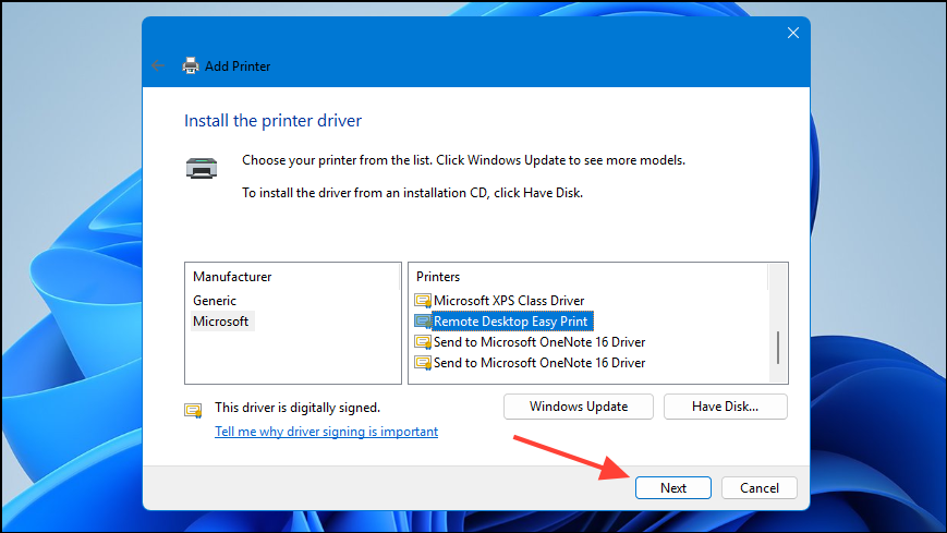 - Select the printer you want to add on the next page before clicking on the 'Next' button. Make sure to select the 'Replace the current driver' option.