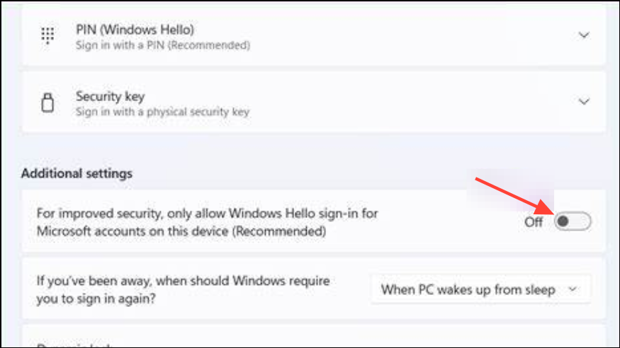 Step 3: Scroll down to the Additional settings section. Locate the option labeled For improved security, only allow Windows Hello sign-in for Microsoft accounts on this device.