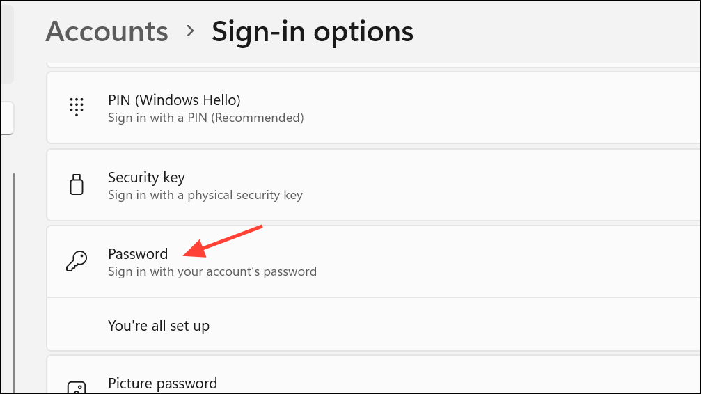 Step 3: If your account does not have a password, set one by clicking Password under Sign-in options and following the prompts.