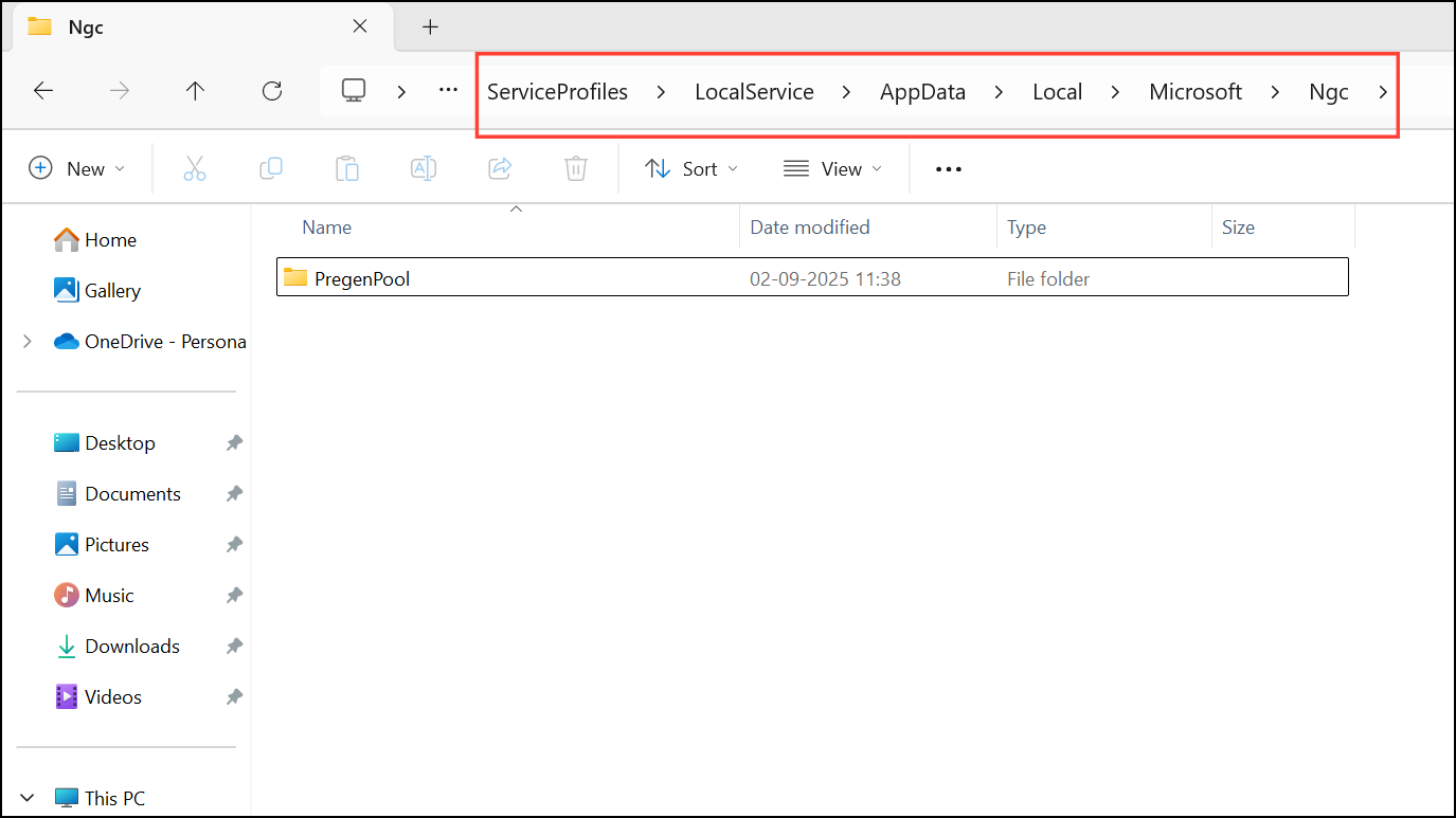 Step 1: Navigate to C:\Windows\ServiceProfiles\LocalService\AppData\Local\Microsoft\NGC. If you can't access this folder, you may need to take ownership and grant permissions.