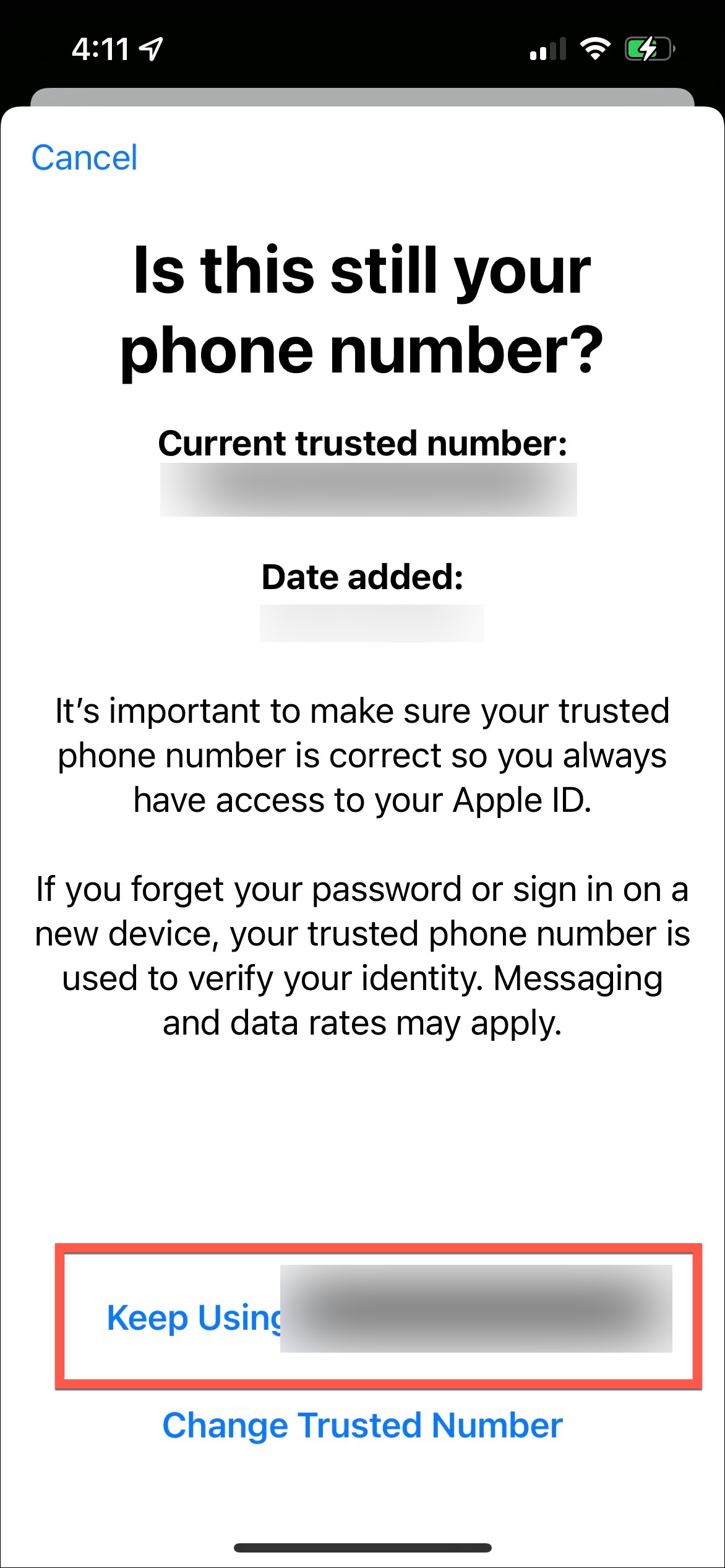 - From the next screen that says 'Keep Using' or 'Change trusted number', tap on 'Keep using'. Then, tap 'Done' on the next screen.