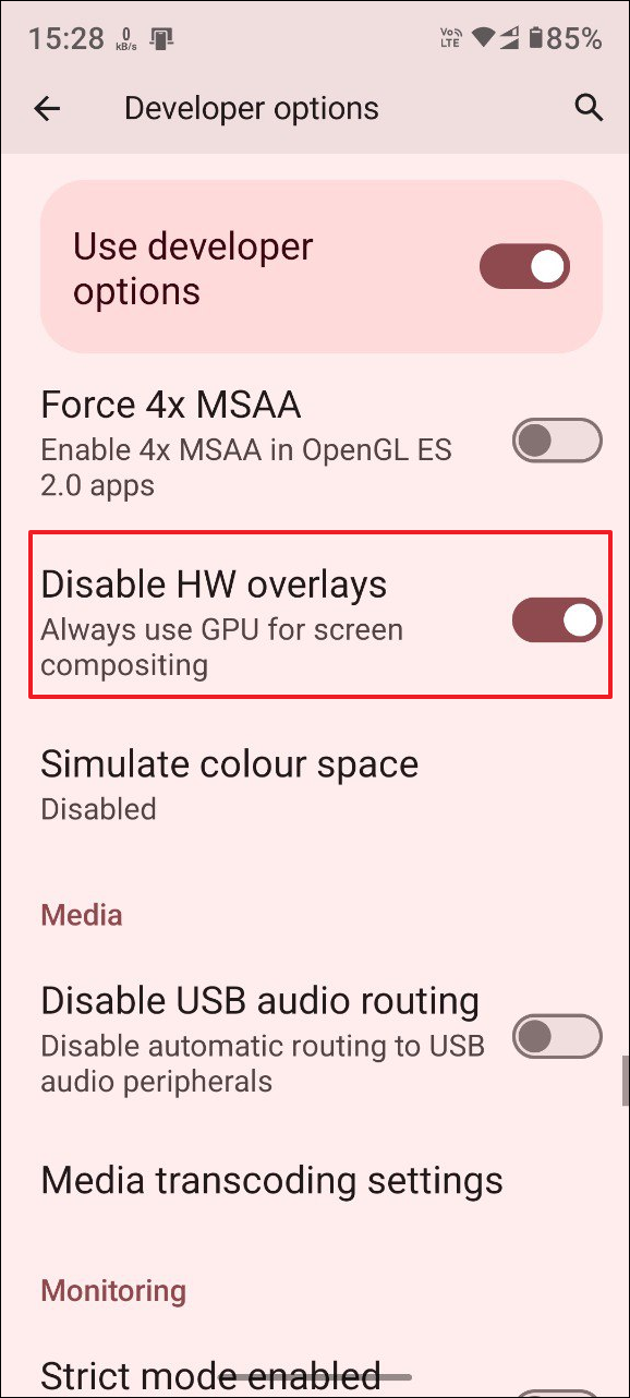 - On the Developer Options page, find the 'Disable HW overlays' setting and tap on its toggle to enable it. Keep in mind that this will consume your battery faster as your device will now render images using the GPU.