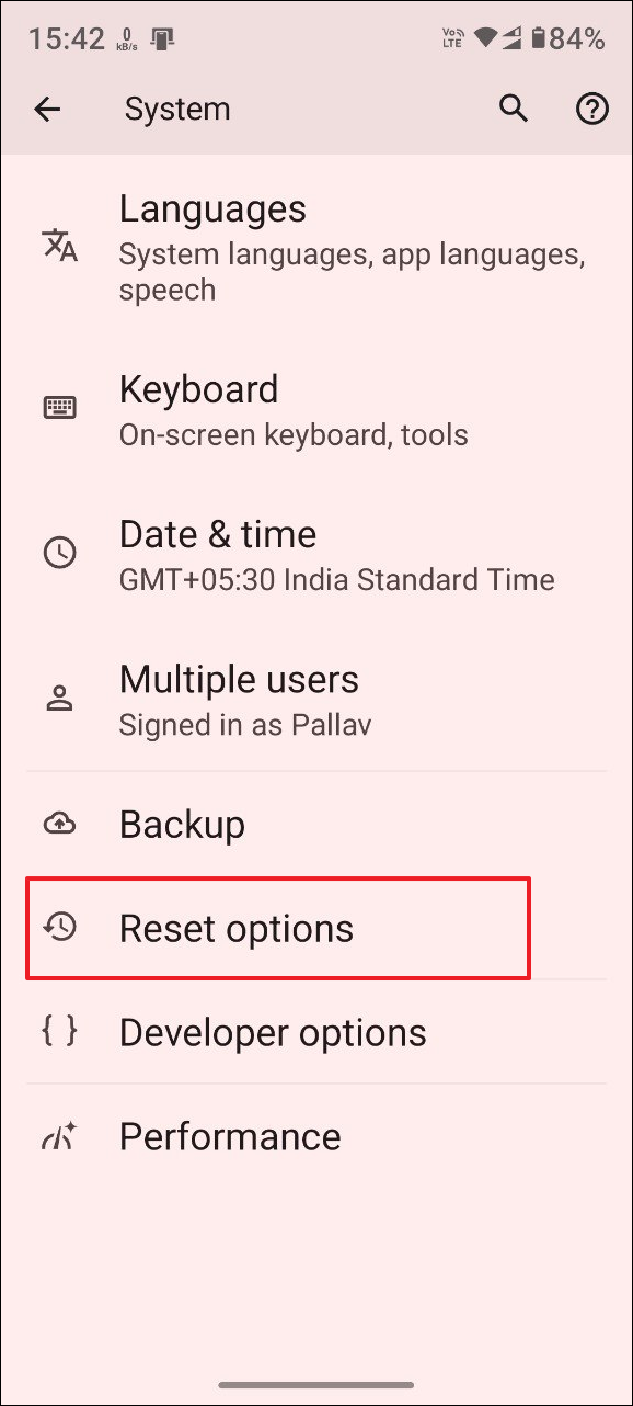 - On the System page, tap on 'Reset options'.