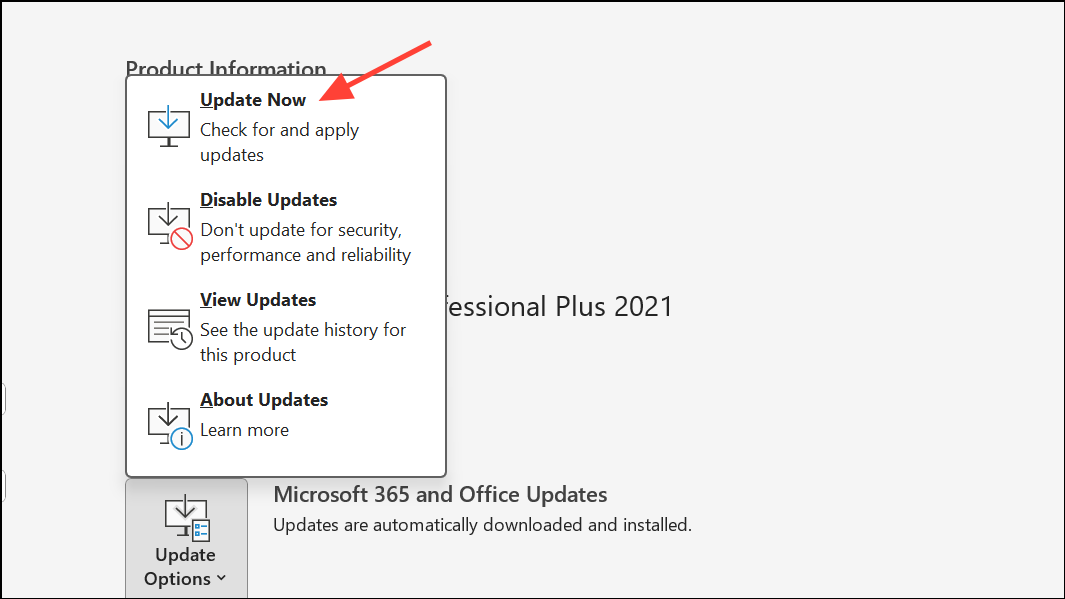 Step 1: To update, open the File menu, select Account, and click Update Options > Update Now.