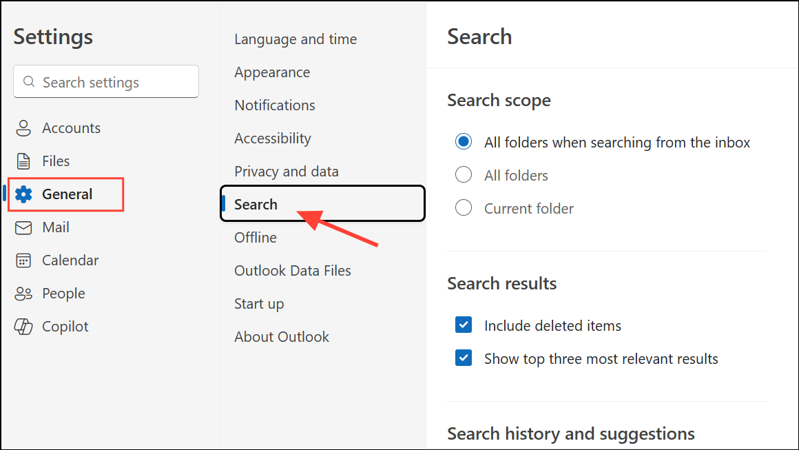 Step 1: Open New Outlook and select Settings from the top right corner. Navigate to General > Search.