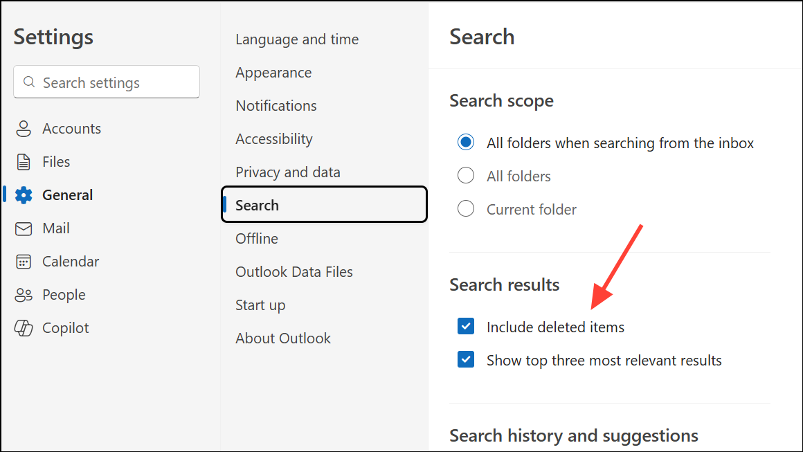 Step 3: If deleted items are missing from search results, ensure the Include deleted items option is checked under Search results in the same menu. Saving this setting expands search coverage to the Deleted Items folder.