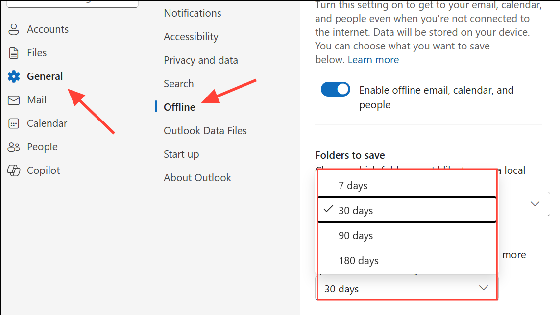 Step 4: To increase the range of emails available for searching, go to Settings > General > Offline and adjust Days of email to save to a longer period. This downloads more historical emails for local indexing, which can resolve issues where searches miss older messages.