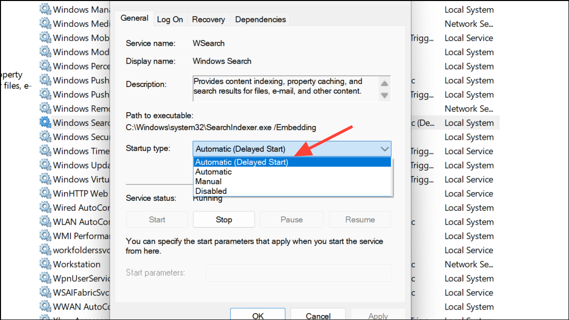 Step 2: In the list, find Windows Search, double-click it, and set Startup type to Automatic (Delayed Start). If the service is not running, click Start to activate it. This ensures the search indexer is always available for Outlook.