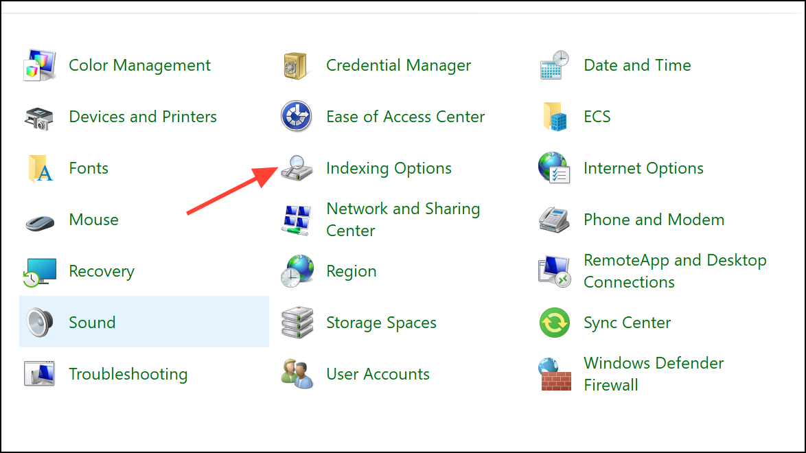 Step 1: Exit Outlook. Open Indexing Options from the Windows Control Panel.