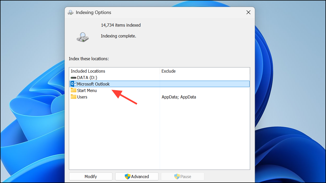 Step 2: Confirm that Microsoft Outlook appears in the Included Locations list. If missing, click Modify and check the box next to Outlook.